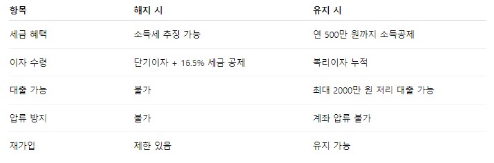 정말 해지가 필요한 상황이라면 세금, 이자 손실, 혜택 상실 등을 꼼꼼히 따져보시고, 가능한 대안을 활용해 손해를 최소화하시기 바랍니다.