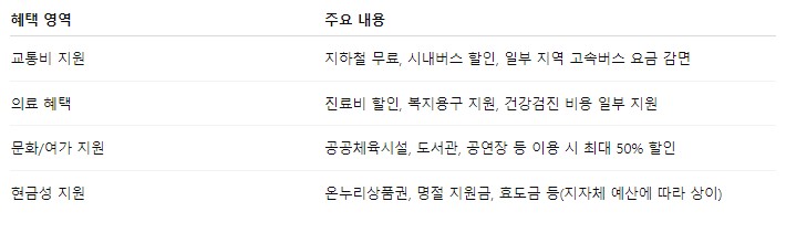 각 지자체에서 운영하며, 어르신 행복카드, 경로우대카드, 효도카드 등 지역마다 명칭은 다르지만 목적은 동일합니다.